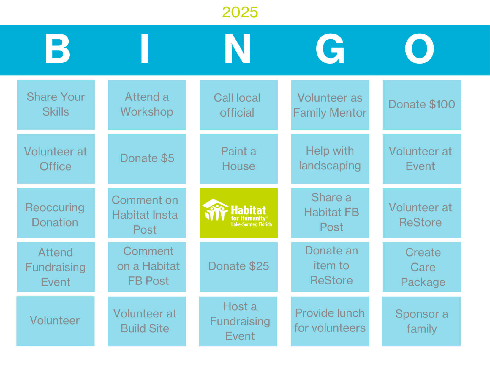Want to go a step further? Participate in our BINGO GAME! Complete five in a row and make yourself a winner. Let us know when you win by emailing us at marketing@habitatls.org!